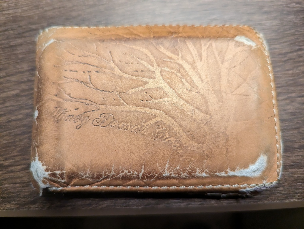 I had a wallet for over fourteen years. Surprisingly bought it from Walmart way back when. The words on the front of the wallet are: “money doesn’t grow on” and then there is a picture of a tree. Ironic to me that it is only now starting to break down and need to be replaced. Maybe I’m finally learning the lesson.
